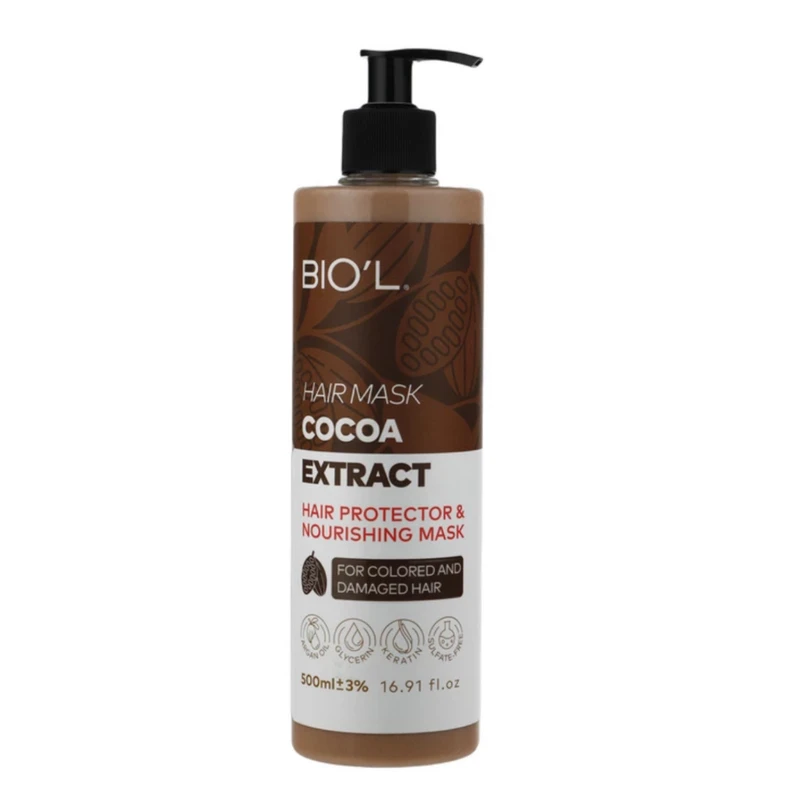 ماسک مو بیول، حجم 500 میلیلیتر، مغذی، محافظت کننده، تثبیت کننده رنگ مو، سازگار با موهای رنگ شده و آسیبدیده، دارای عصاره دانه کاکائو، مدل کاکائویی